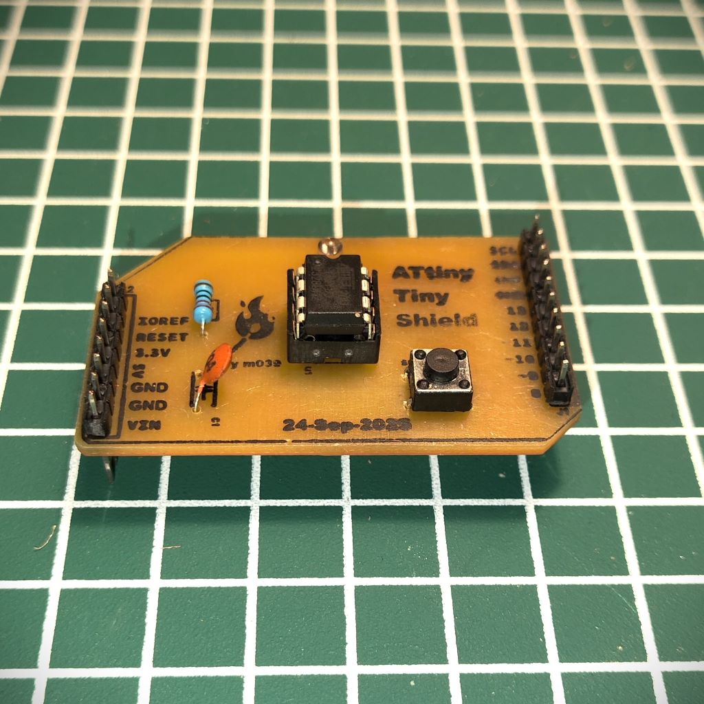 В итоге все очень просто работает. Делаешь из Arduino UNO DIY программатор ISP и прошиваешь ATtiny85, который находится на ATtiny Tiny Shield. Прошивается и светодиод моргает.