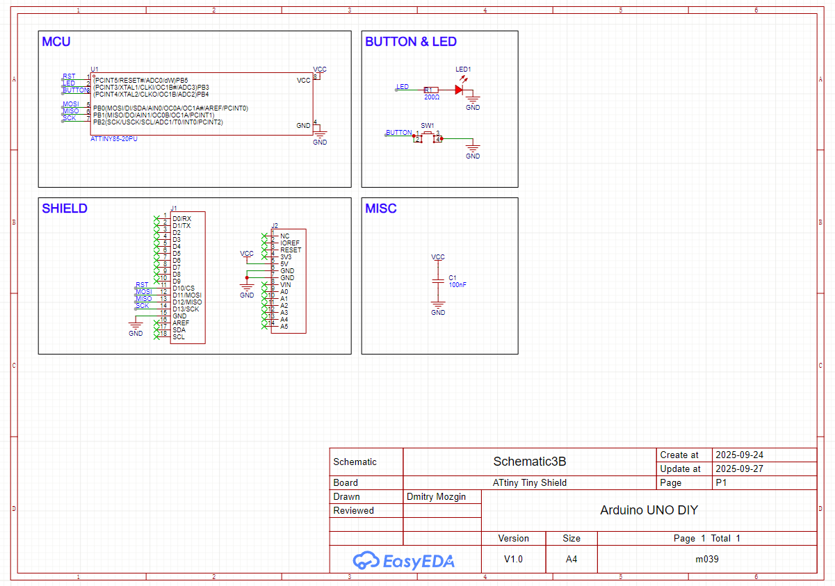 По началу принципиальную схему из Make Your UNO Kit я изучал и пытался полностью повторить, но после всего, что делал, скажу, что самая удобная схема это все же из MiniCore и она полностью совместима. Надо добавить, что принципиальная схема Arduino UNO R3 гораздо сложнее выглядит, чем из Make Your UNO Kit. Что-то интересное не нашел, но мне запомнился один момент, это странное подключение светодиода, который используется через BUILTIN_LED