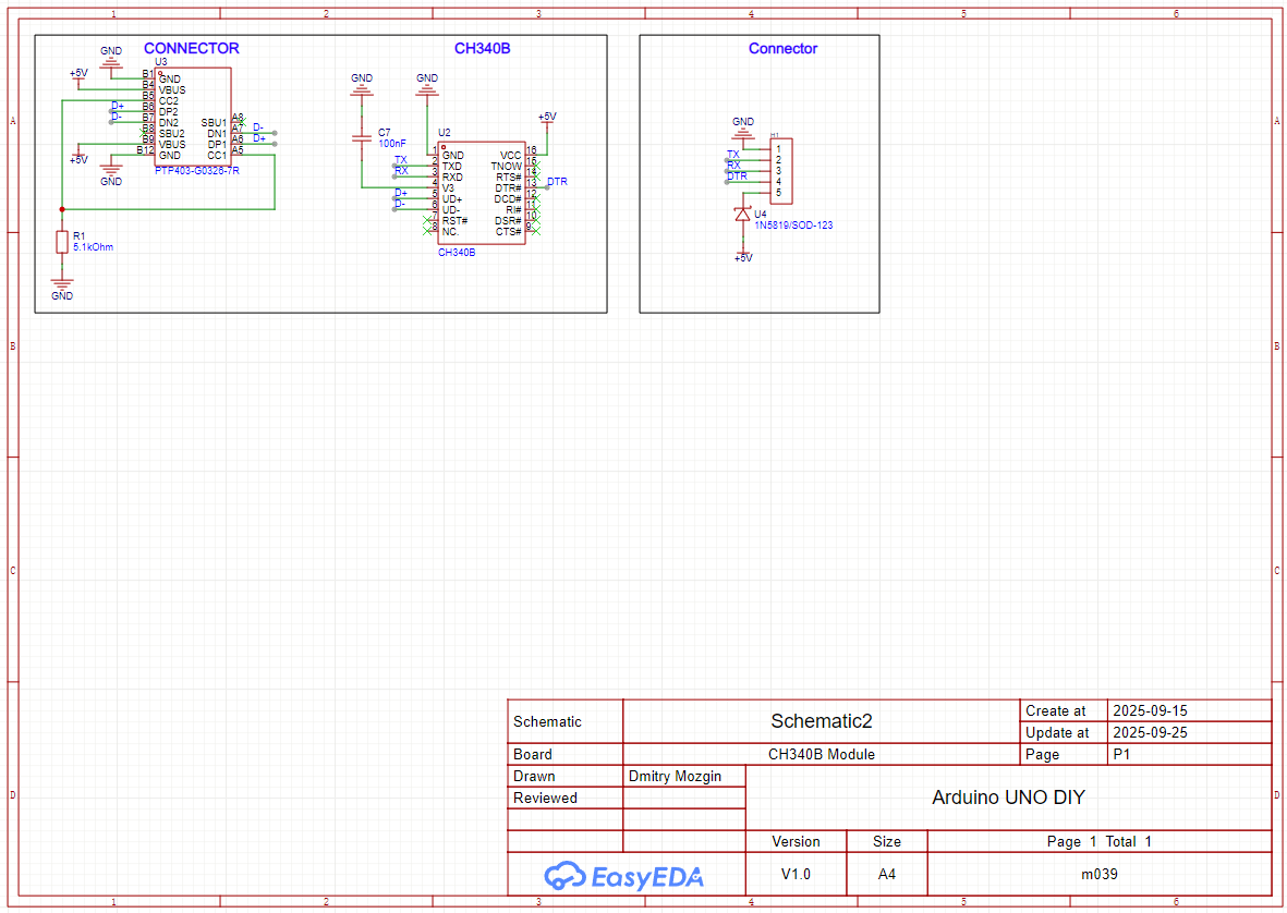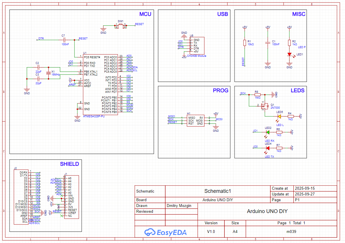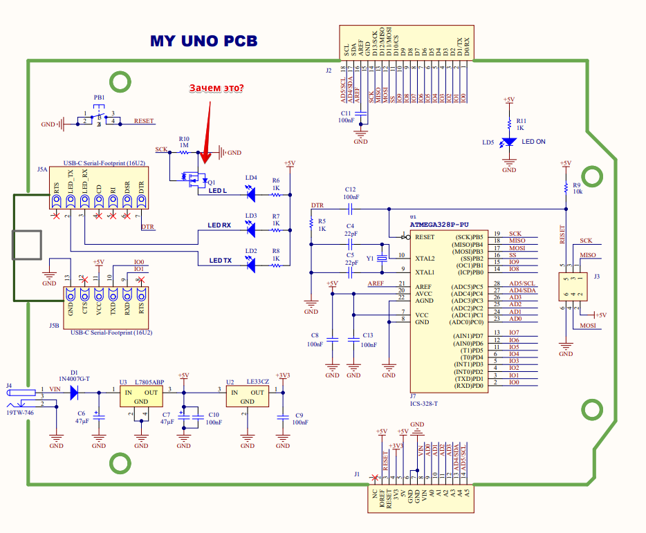 Если говорить коротко, то моя схема отличается от Make Your UNO Kit тем, что там нет разъема питания, все остальное очень похоже, кроме специфики, например, модуля для подключения к USB. А от разъема питания отказался, потому что его практически никогда не использовал, поэтому подумал, что мне он не нужен.