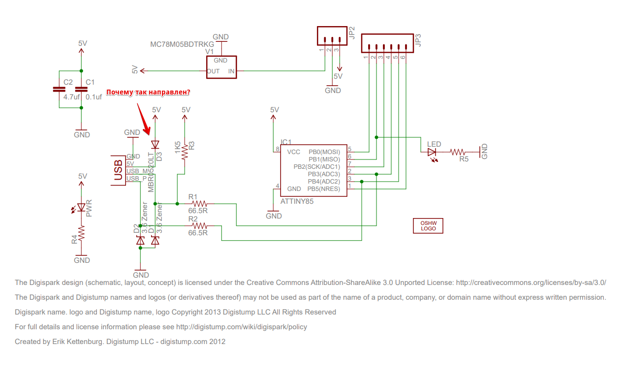 Еще возможно кто-нибудь мне объяснит почему диод направлен катодом к USB порту, как на схеме? Разве схема не будет работать или разве таким образом USB порт компьютера будет менее защищен? Возможно его надо поставить в противоположную сторону, но точно не знаю, раз это официальная схема. Я хотел задать вопрос на Stack Overflow, но не успел еще этого сделать.