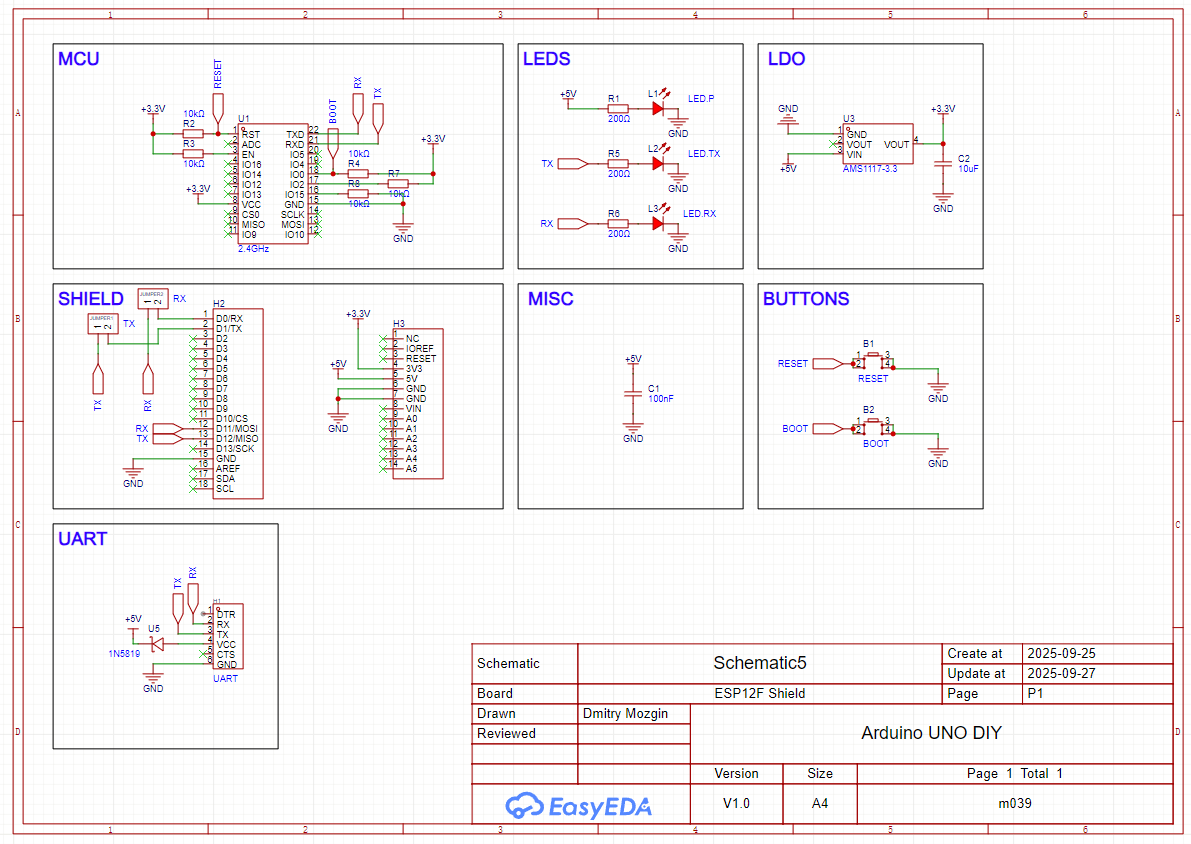 Но прежде, чем я мог составить эту принципиальную схему, мне нужны были размеры платы. И они очень легко находятся в Make Your UNO Kit, только проблема в том, что они сделаны в Altium Designer, а в открытом доступе конвекторов их в формат например EasyEDA я не нашел. Но самое забавное, что в EasyEDA есть опция импортировать схему из Altium Designer, но нужен ascii формат файлов, а у них был только бинарный. Потом я пробовал импортировать Altium Designer в KiCAD, оно получалось, но как это потом экспортировать в EasyEDA я так и не понял. В общем, ни один способ не работал. В итоге я делать этого не хотел, но “достал” копию Altium Designer, сконвертировал этот бинарный файл в ascii формат, импортировал в EasyEDA и удалил Altium Designer.