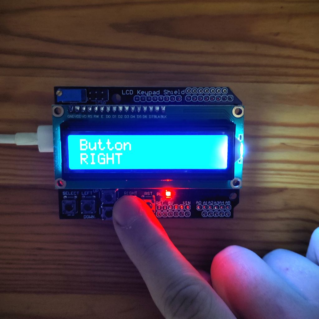 Фото платы расширения с текстовым экраном и кнопочками с запущенной программой на Arduino UNO DIY