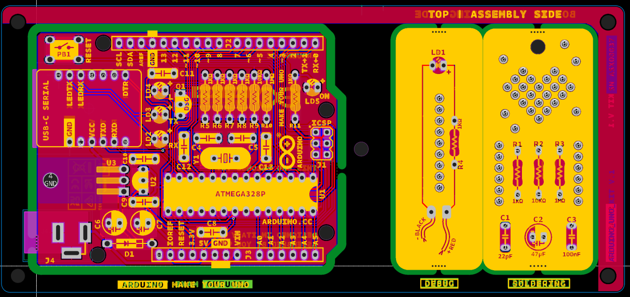 Arduino UNO DIY это по сути урезанная версия оригинальной платы Arduino UNO, возможно одно существенное преимущество, это наличие USB Type-C разъема, но и такую плату тоже можно найти сейчас в продаже, поэтому спорно. Во всем остальном одни минусы: отсутствие линии 3.3В и разъема питания. Это те выводы, которые можно сделать при беглом осмотре платы, но как по мне есть один существенный минус, который все перекрывает, это нет металлизированных отверстий, из-за чего разъемы для крепления плат расширения могут отвалиться, очень и очень легко. Поэтому один раз будешь долго делать такую плату, а потом она развалится в руках.