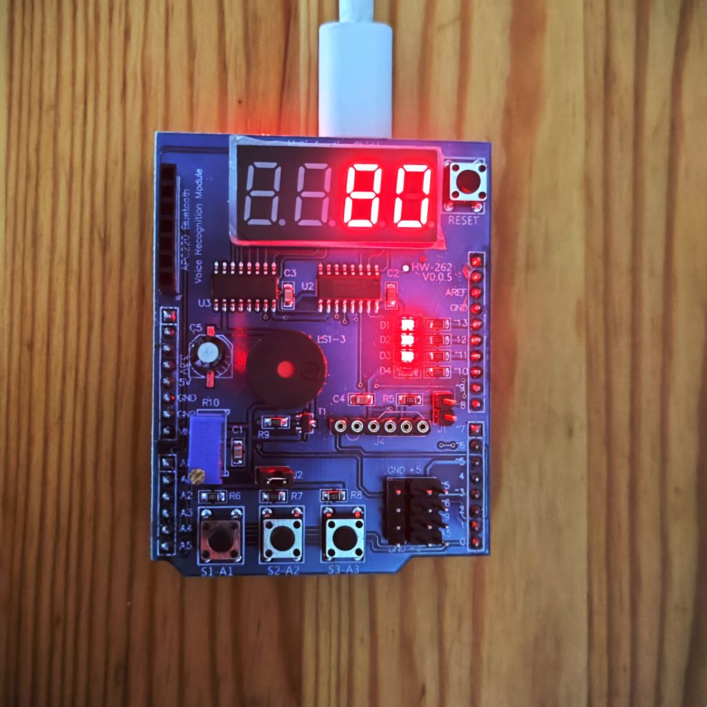 Это плата расширения из сборной солянки. Тут есть кнопочки, пищалка, семисегментный индикатор. Занятная штука. Сначала хотел для неё что-то написать, но потом решил, что лучше воспользуюсь готовым кодом из интернета и пойду дальше по плану. Нашел библиотеку MFShield, взял из неё тестовый пример и запустил его на плате, что вы можете видеть на фотографиях.