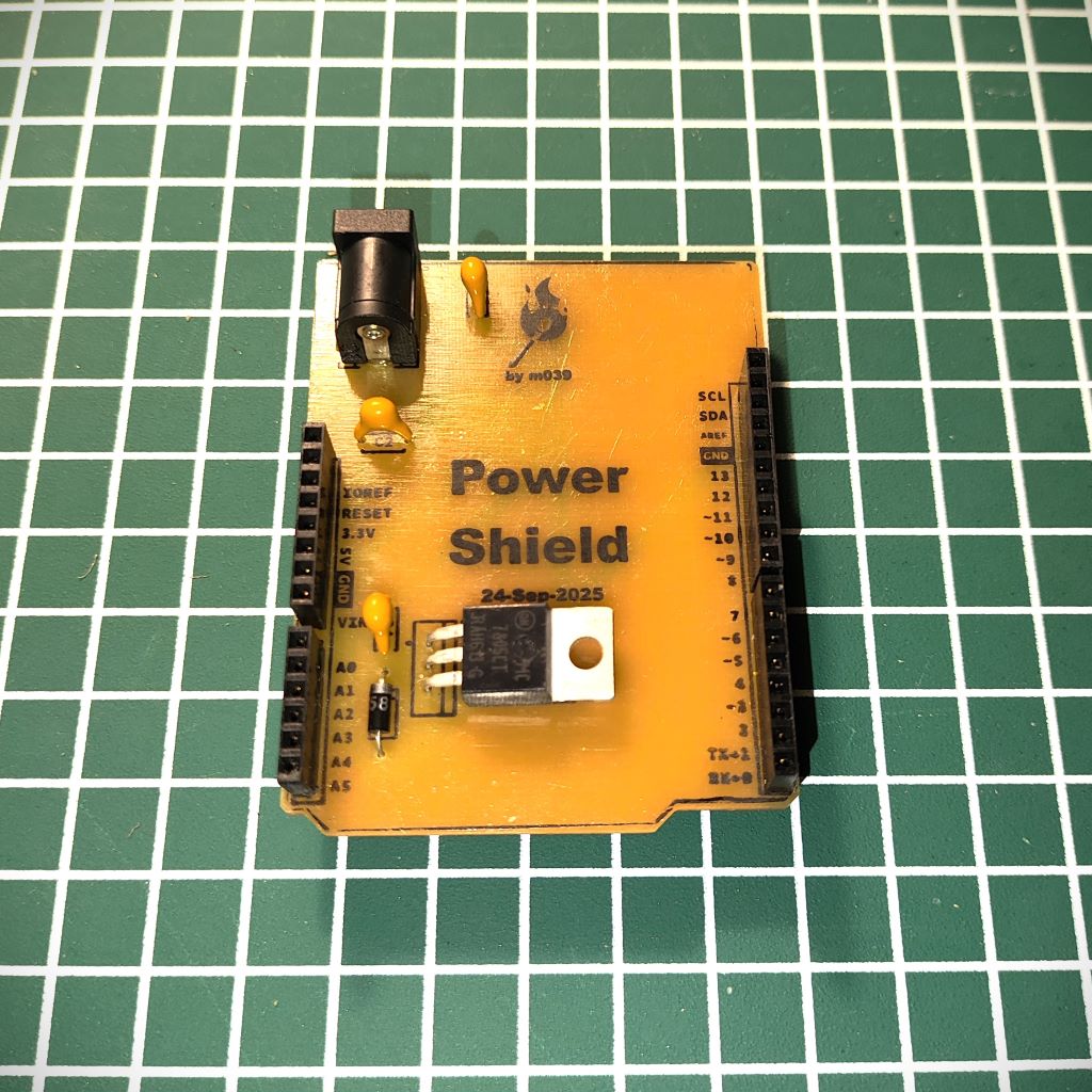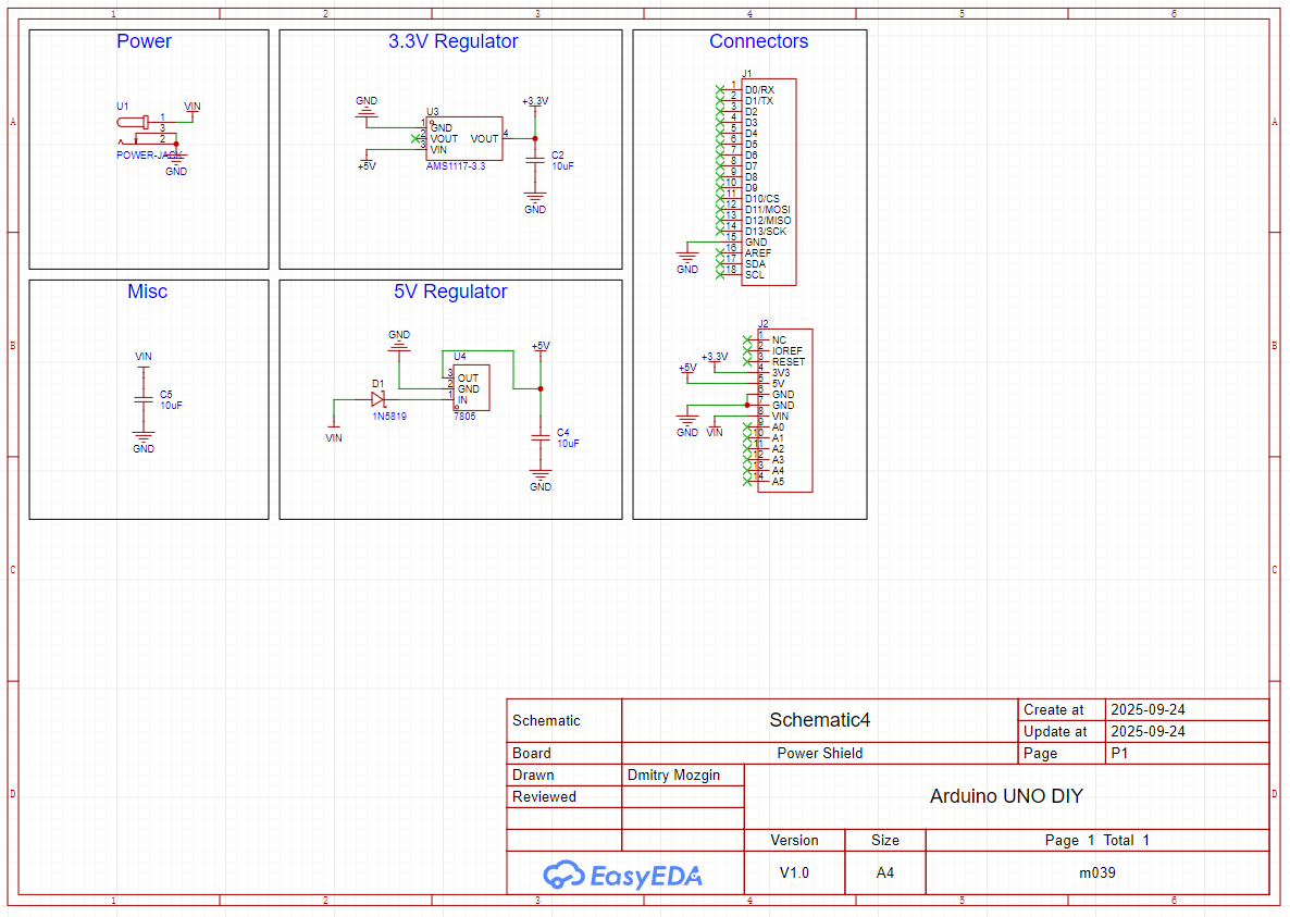 В этой плате на самом деле ничего сложного, два регулятора напряжения, один на 5В, другой на 3.3В и диод на вход. Схему подсмотрел в Make Your UNO Kit. Я подумал, раз Make Your UNO Kit подразумевает питание от двух источников и там нет никакой защиты, то не стал её тоже добавлять. Теперь, получается можно сделать бутерброд из Arduino UNO DIY, Power Shield и любой другой платы расширения, которому нужны 3.3В и логика от Arduino UNO DIY. Можно даже обойтись без Arduino UNO DIY.